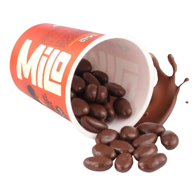 Milo?? No. Just sounds like MiLo. It is crunchy biscuits wrapped in premium dark or milk chocolate!