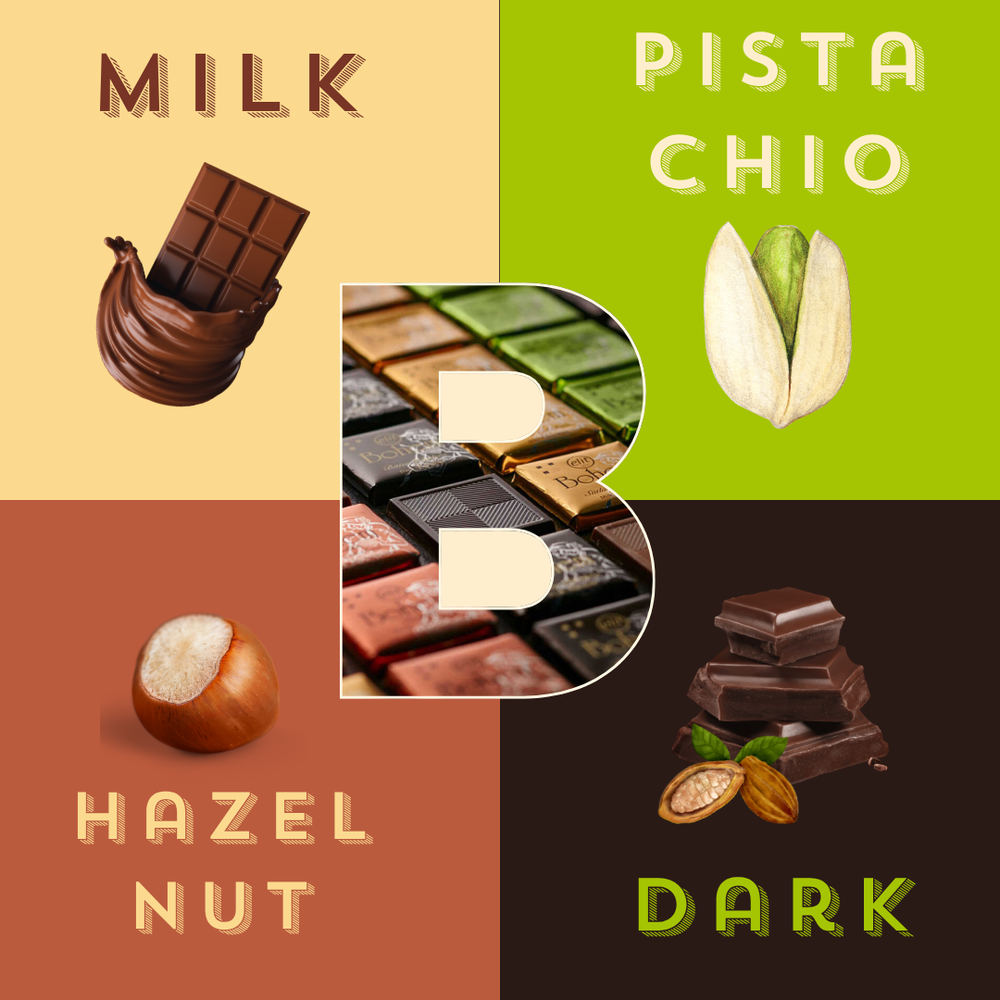 - Assortment of Milk, Dark, Pistachio, Hazelnut Chocolate