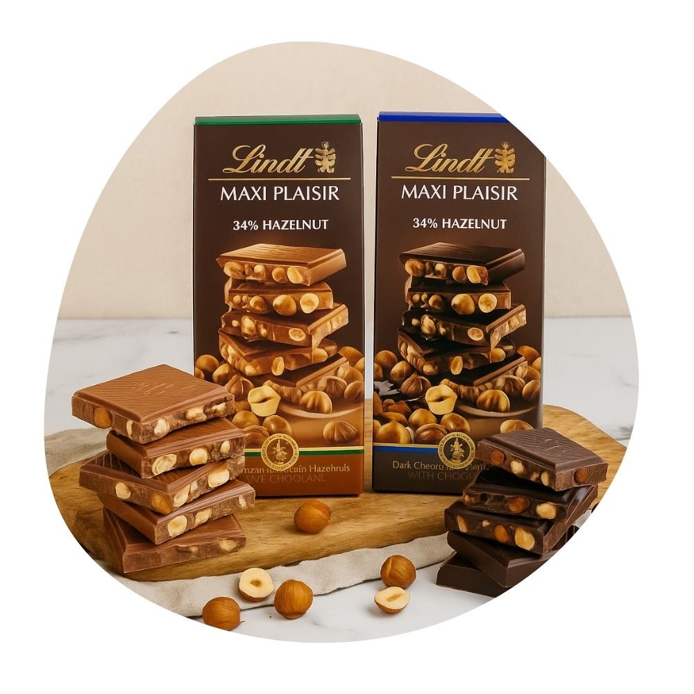 Lindt Maxi Plaisir adalah pilihan anda untuk pengalaman coklat yang rangup & lazat, dengan 34% keseluruhan hazelnut panggang aromatik. Dihasilkan dengan coklat Swiss gelap atau susu premium, ia menawarkan tekstur yang benar-benar menarik & rasa yang kaya.